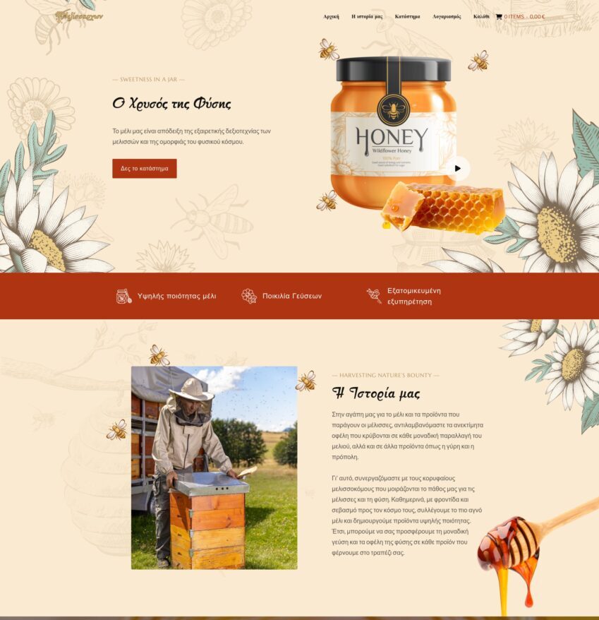 - Σχεδιασμός Ιστοσελίδας: Η ιστοσελίδα σχεδιάστηκε με σκοπό να παρουσιάσει τις βασικές πληροφορίες για τον νέο μελισσοκόμο, όπως το πάθος του για τη μελισσοκομία και τη διαδικασία παραγωγής μελιού. Παράλληλα, η πλατφόρμα είναι πλήρως λειτουργική, με ένα εύχρηστο κατάστημα όπου οι επισκέπτες μπορούν να αγοράσουν τα προϊόντα του με ευκολία.